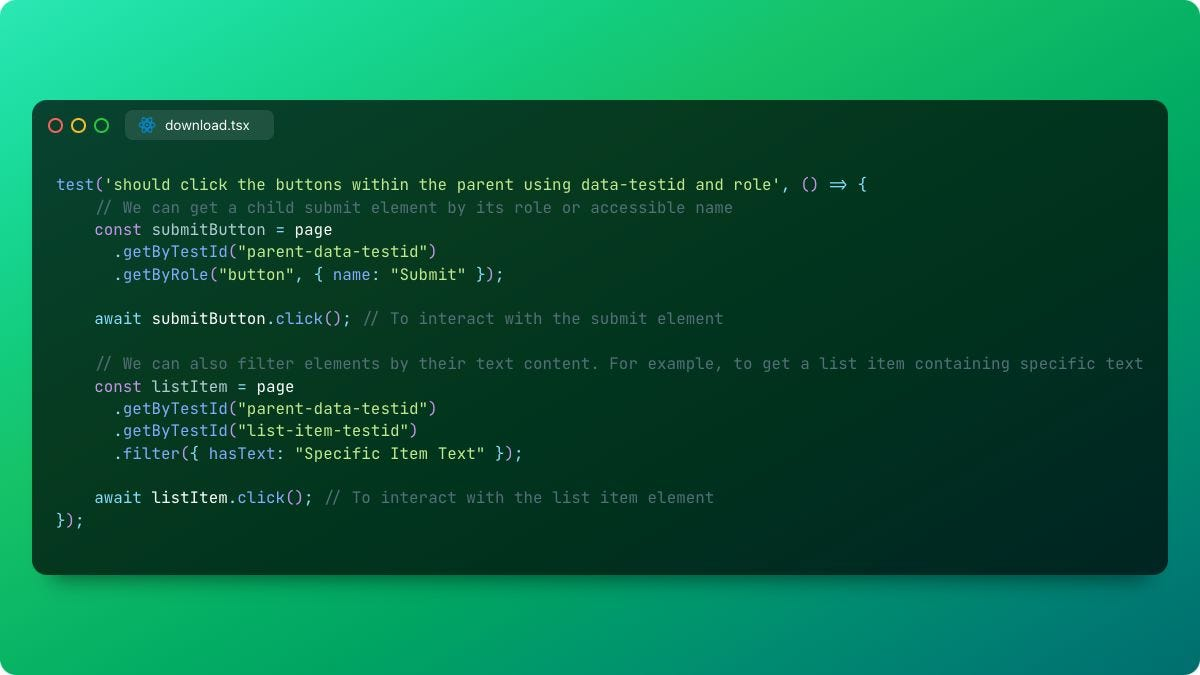 Not all elements have a specific data-testid present with them. In such cases, we can chain multiple data-testids or filter roles by name/data-testid instead of using class/id.